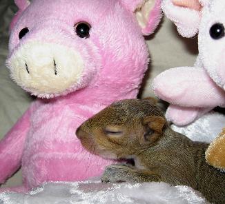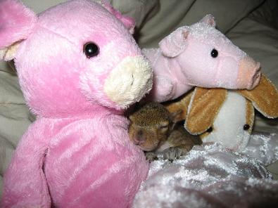 Scooby with her new cuddle toys. She weighs 94 grams as of today.